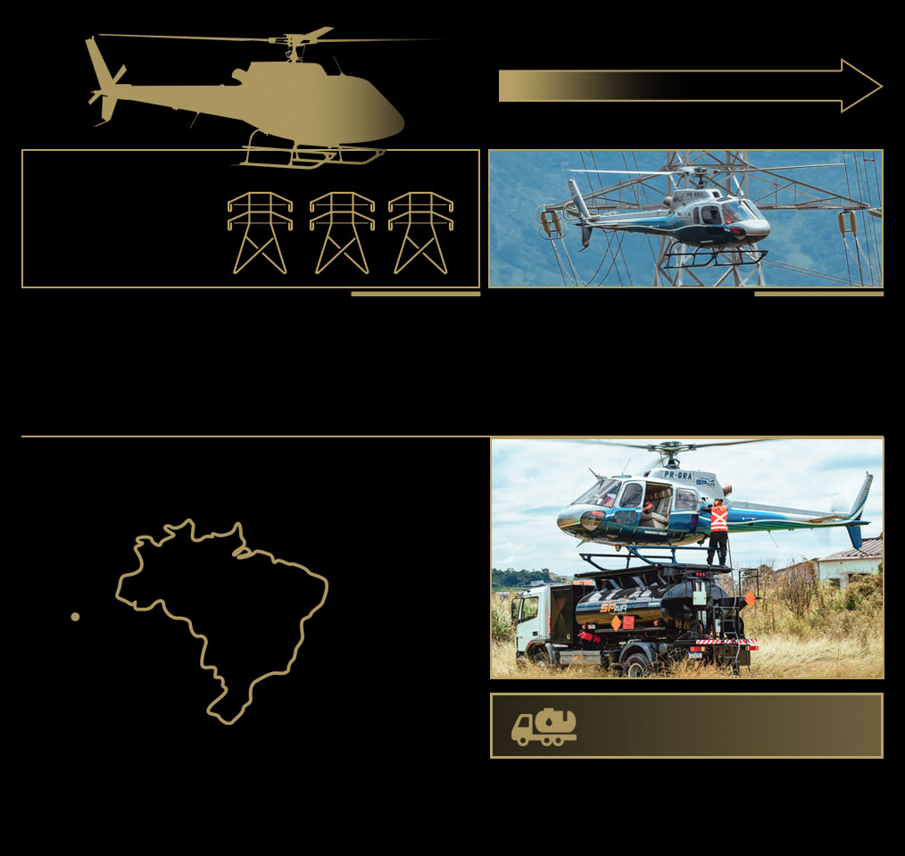AUTONOMIA PARA ATÉ 3 HORAS DE VOO ININTERRUPTOS SEJA PARA INSPEÇÕES PREVENTIVAS, RÁPIDAS IDENTIFICAÇÕES DE CAUSAS DE DESLIGAMENTO, INSPEÇÕES PRÉ-ENERGIZAÇÃO OU FISCALIZAÇÃO DE FAIXAS DE SERVIDÃO, O HELICÓPTERO ATUA COM EFICIÊNCIA EM TODO BRASIL NOS MAIS COMPLEXOS CENÁRIOS DE NOSSO PAÍS. FROTA DE CAMINHÕES PARA ABASTECIMENTO *OPCIONAL USO DE CÂMERA E SENSORES . OPERAÇÕES EM TODO TERRITÓRIO NACIONAL INCLUSIVE NA AMAZÔNIA